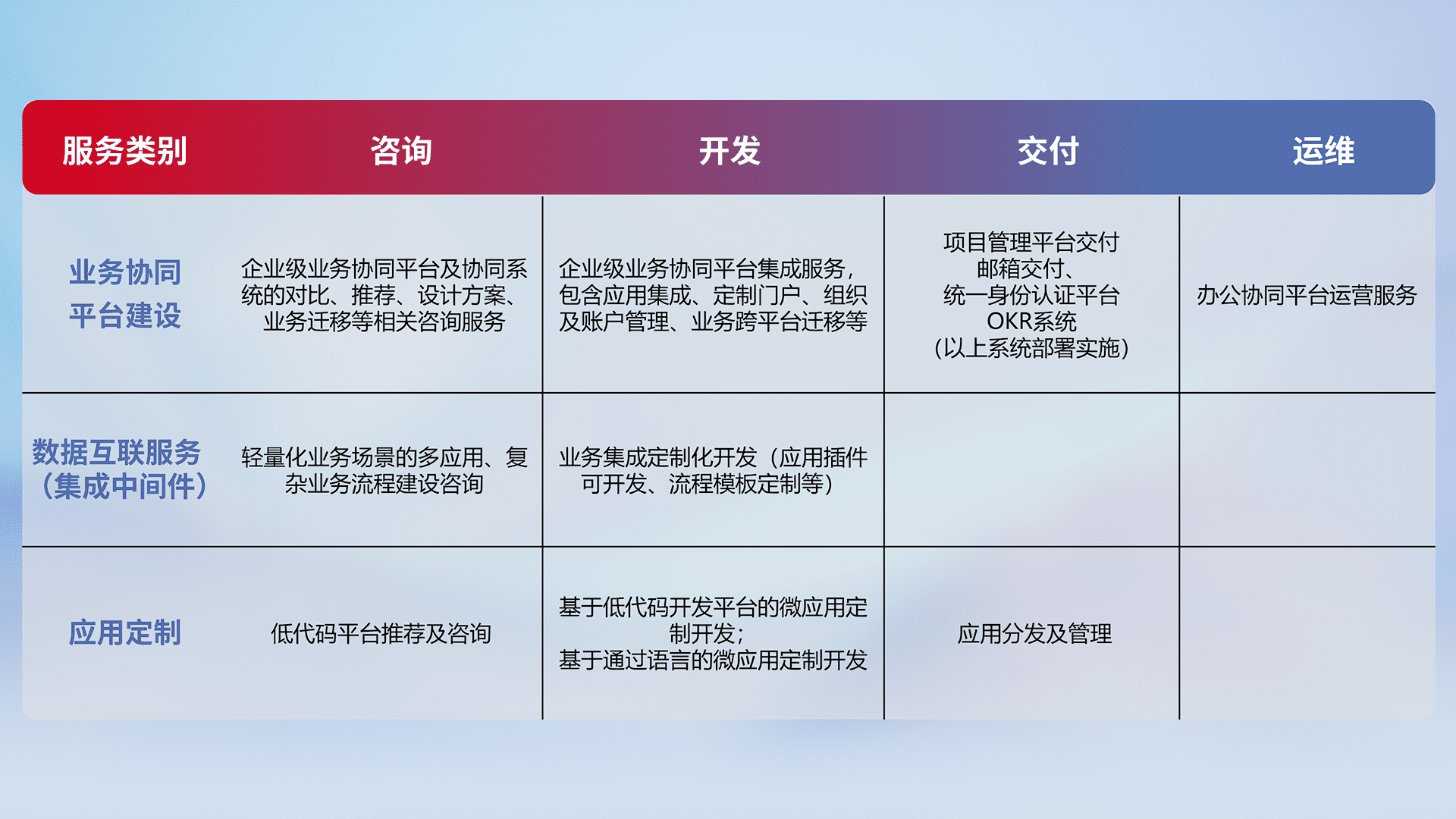 针对钉钉、、、、企微、、、、IDaas等平台级产品提供产品的规划、、、、方案、、、交付、、定制化开发等服务,,,,实现如统一协同办公、、、、智能客户服务、、、、混合会议管理、、、智能数据查询、、、等业务场景,,,,实现数字化转型。。