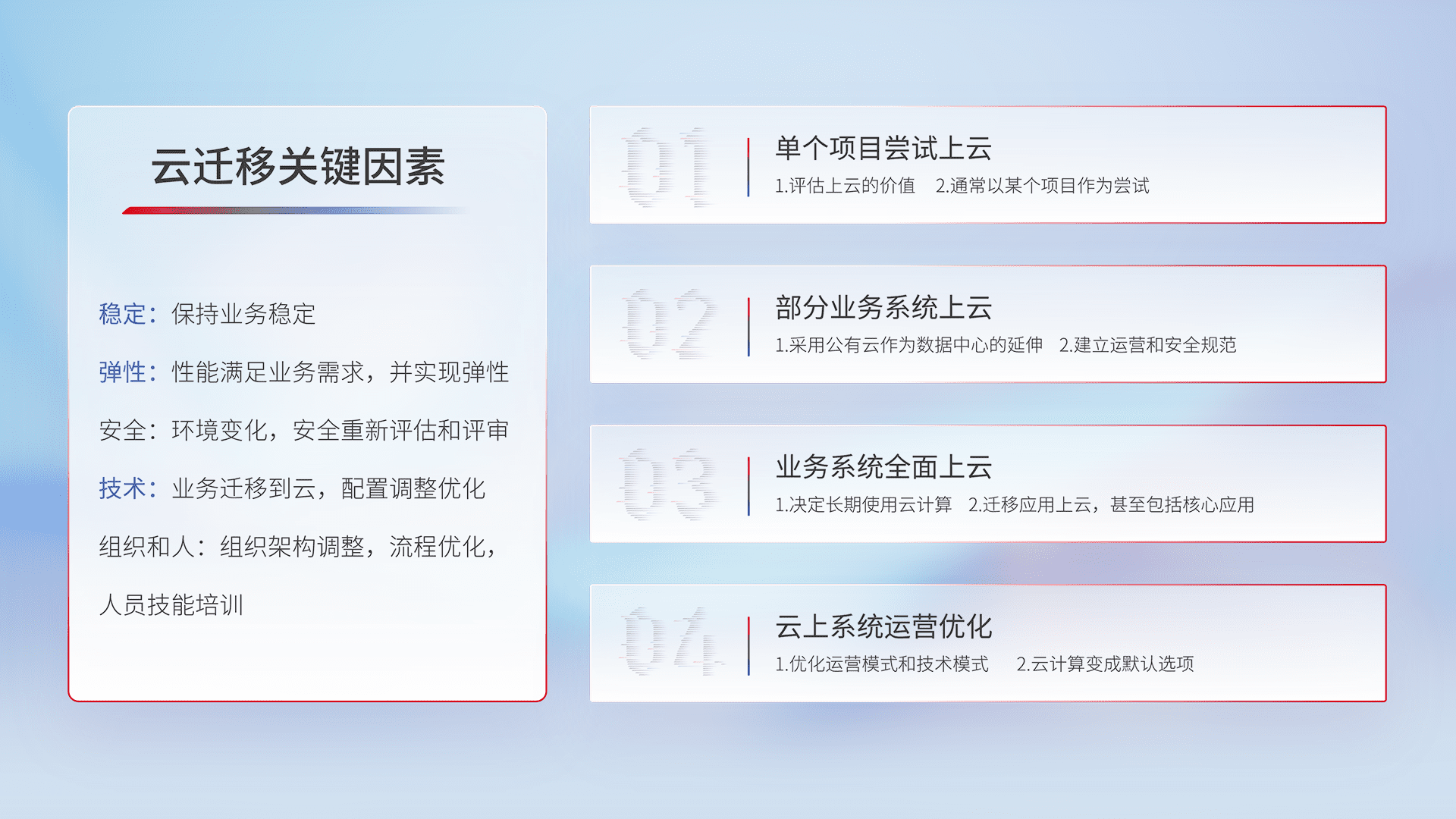 结合实际业务,,,从规划设计、、、、云平台选型、、云原生改造、、、、数据迁移、、、集成交付,,,,迁移全过程为客户识别最佳上云路径,,做好风险识别管理,,设计网络架构、、、身份权限、、、、安全审计合规、、操作审计、、、日志审计、、、监控告警策略、、、、多站点容灾设计等,,,对云上基础设施进行整体规划,,,提升IT治理水平,,以满足弹性、、高可用、、高性能的需求。。。