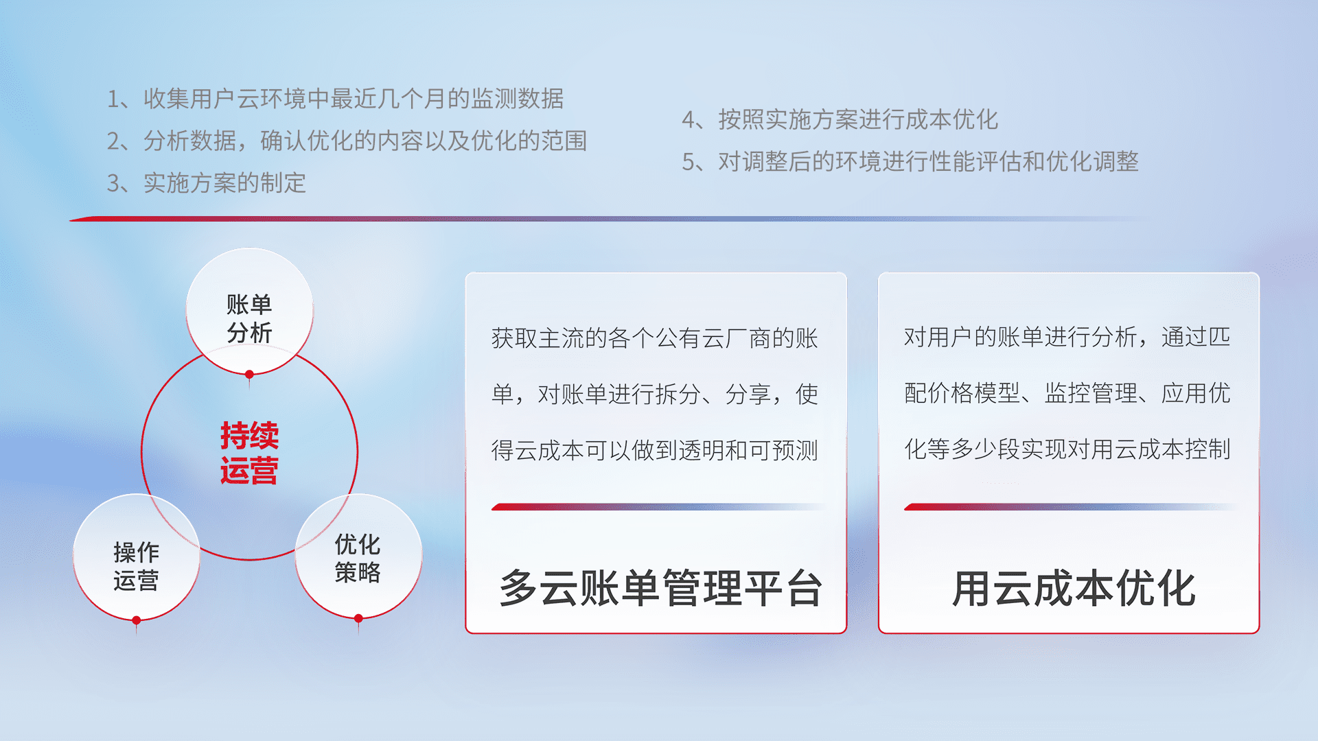 通过多云纳管,,,以统一的资源数据模型把客户的云资源进行抽象和封装,,,,进而实现对多云资源的统一操作,,,保障云资源管理的可靠性、、、稳定性与可用性。。。。量身定制化运维内容,,,,配置、、开发运维、、、补丁管理、、、、备份、、监控、、认证和访问管理、、审计和日常巡检等,,,保障在用云过程中的可靠度,,,,稳定度以及高可用率。。。